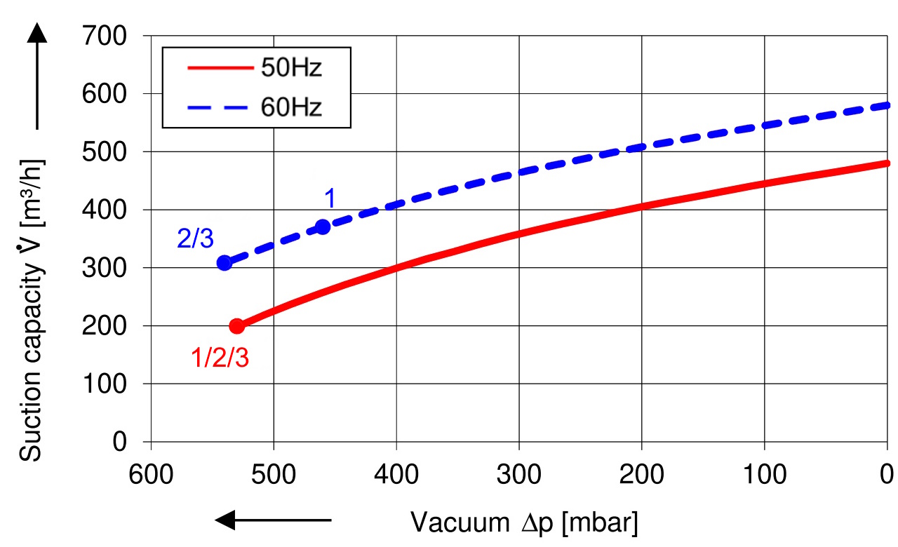 ⇒ Leistung steigt mit der Frequenz → möglicher maximaler Enddruck gemäß Nennlinie - Motoren mit der Endnummer 7 (400 VΔ / 690 VY) werden im Dreieck angeschlossen und können nur mit Leistungsverlust nach oben (> 50 Hz) geregelt werden