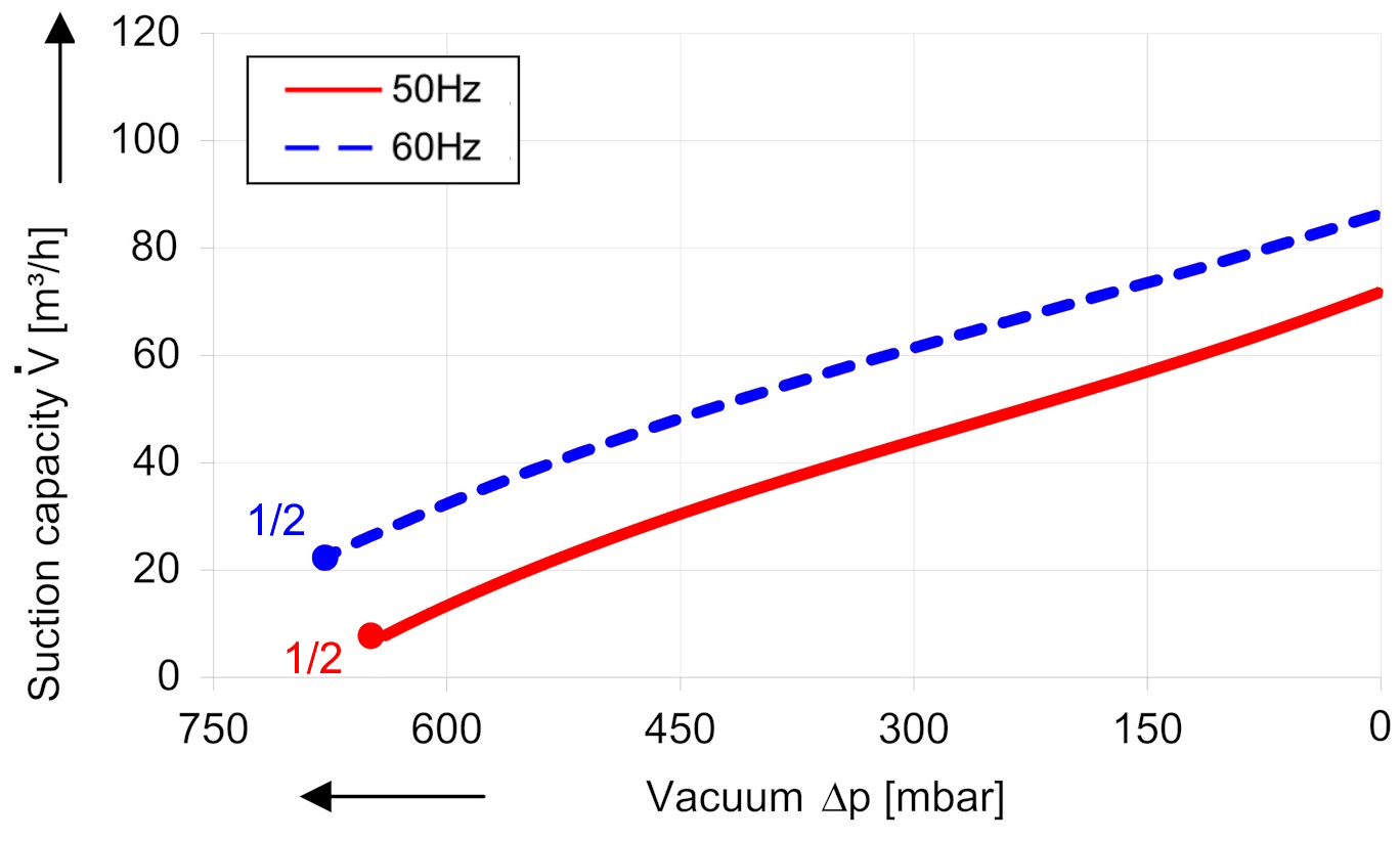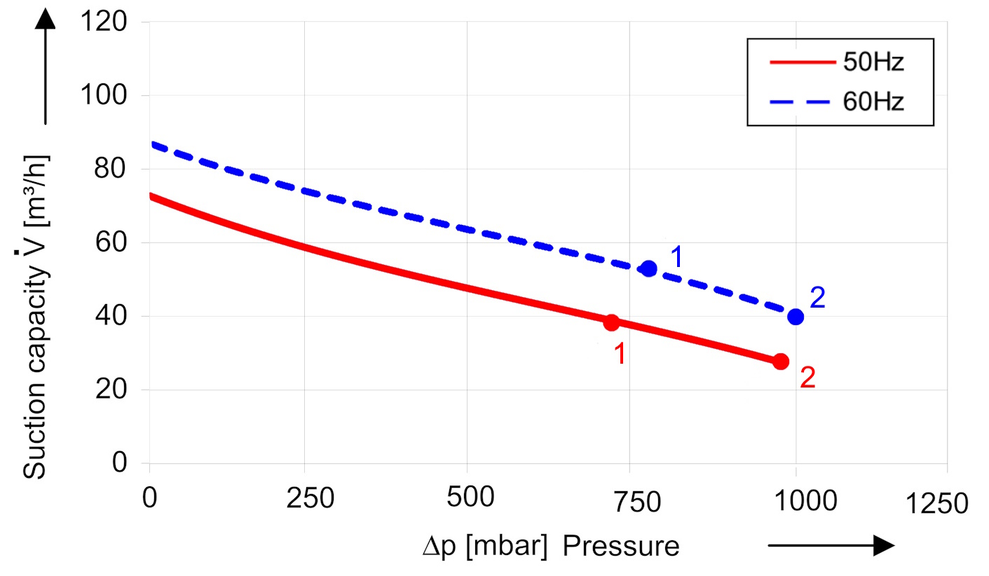 ⇒ Leistung steigt mit der Frequenz → möglicher maximaler Enddruck gemäß Nennlinie - Motoren mit der Endnummer 7 (400 VΔ / 690 VY) werden im Dreieck angeschlossen und können nur mit Leistungsverlust nach oben (> 50 Hz) geregelt werden