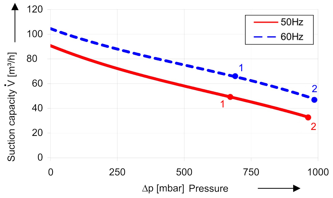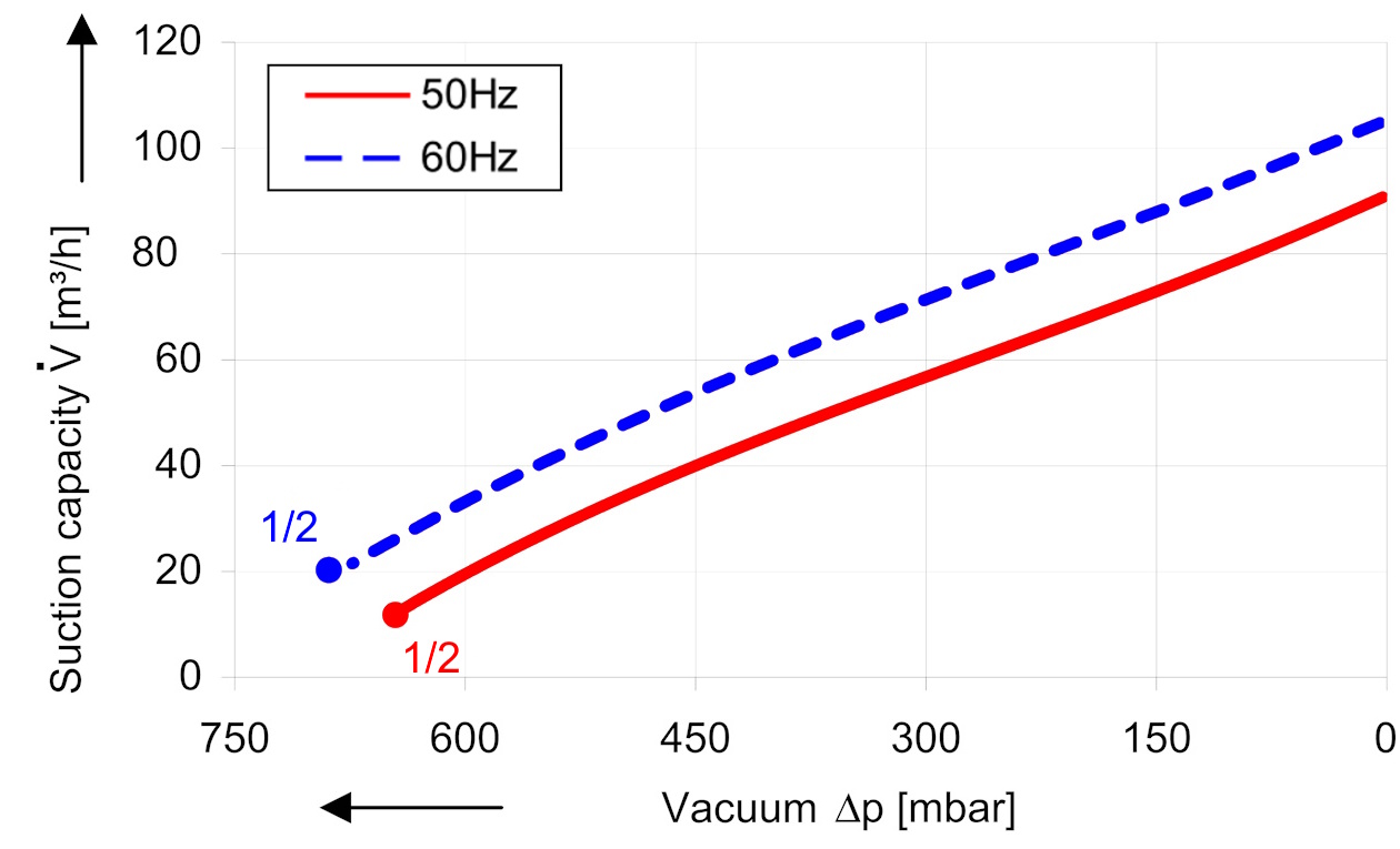 ⇒ Leistung steigt mit der Frequenz → möglicher maximaler Enddruck gemäß Nennlinie