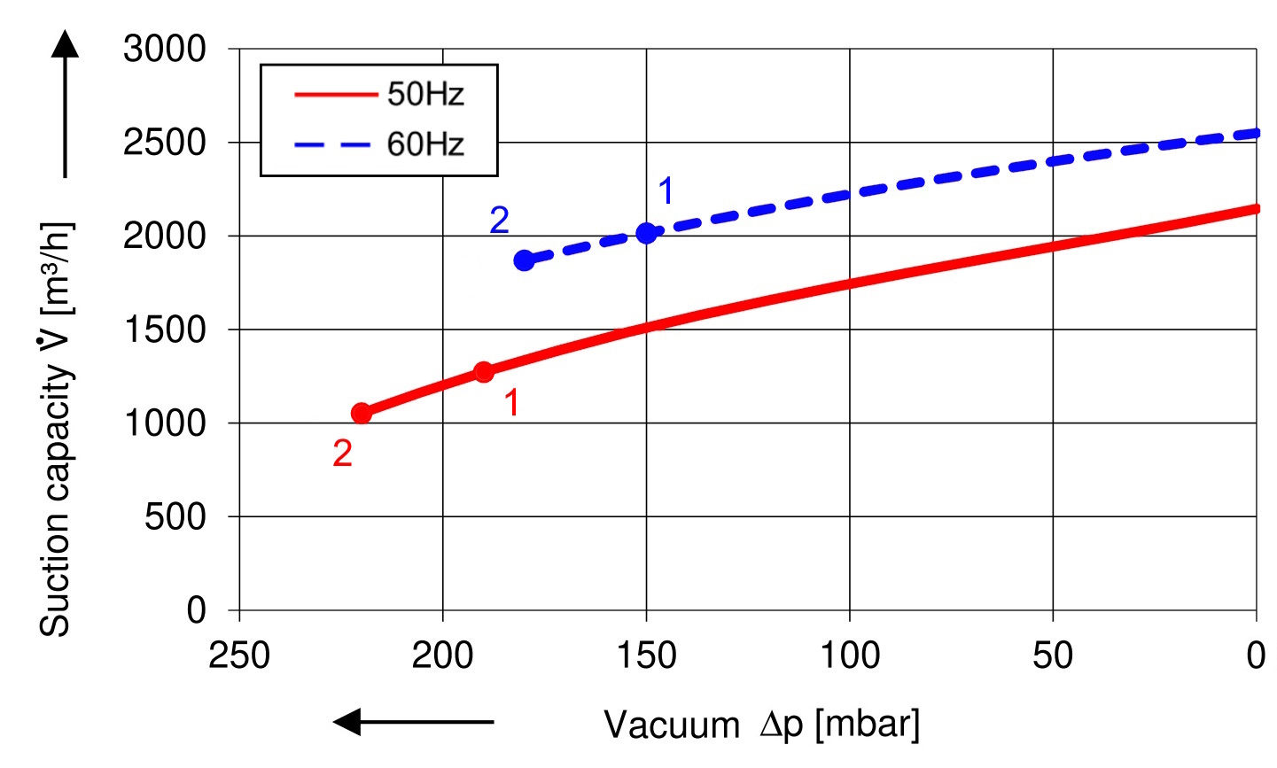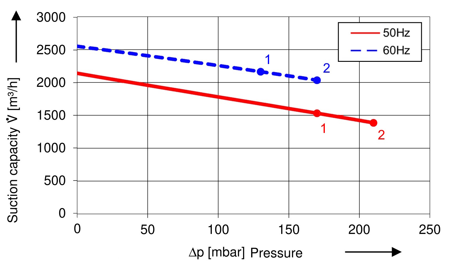 ⇒ keine Leistungssteigerung → möglicher maximaler Enddruck geringer als Nennlinie