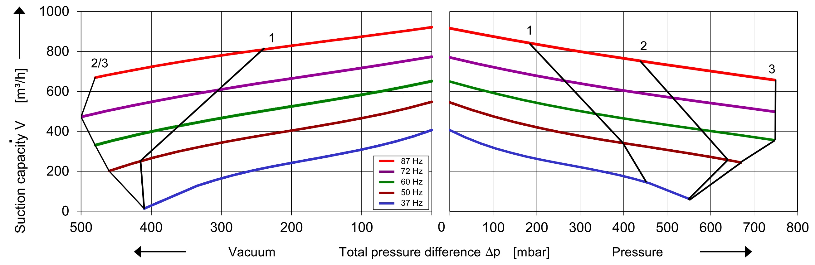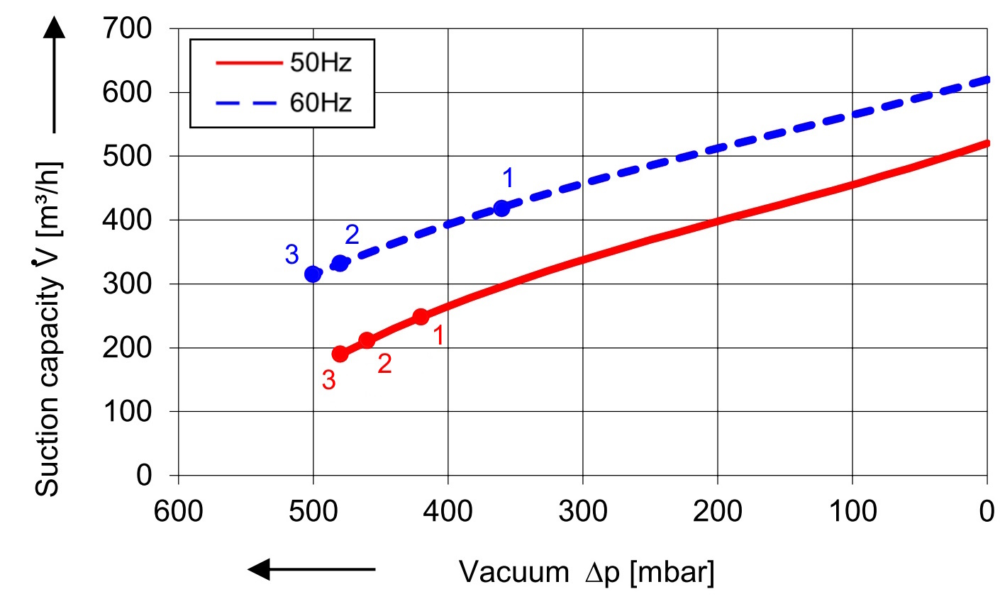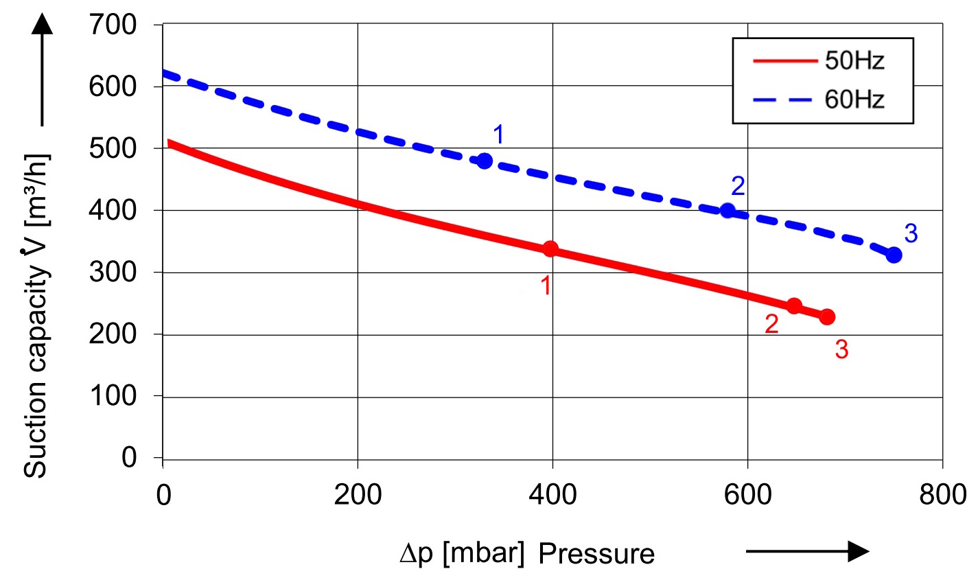 ⇒ Leistung steigt mit der Frequenz → möglicher maximaler Enddruck gemäß Nennlinie - Motoren mit der Endnummer 7 (400 VΔ / 690 VY) werden im Dreieck angeschlossen und können nur mit Leistungsverlust nach oben (> 50 Hz) geregelt werden